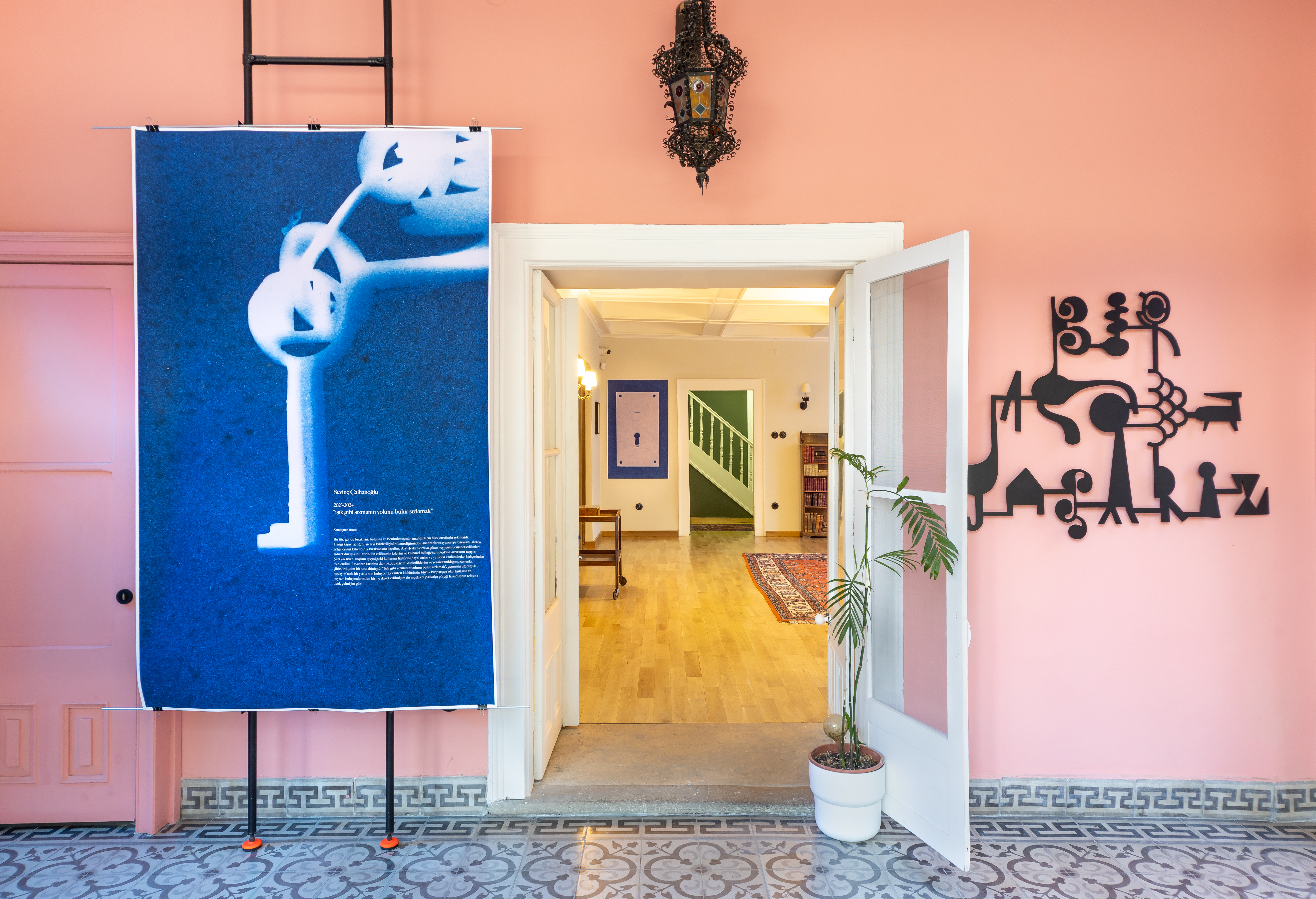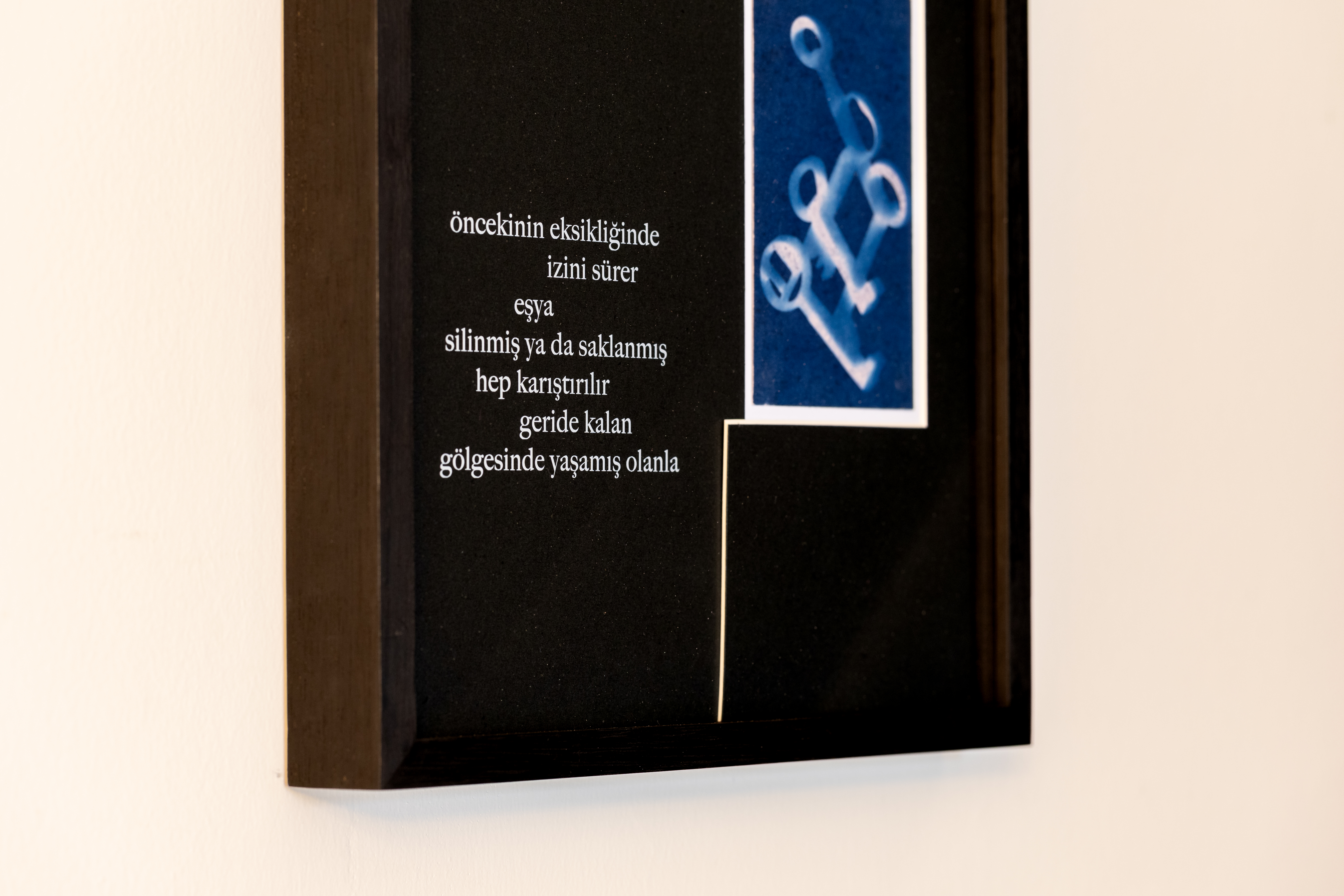 Şey’ler Odası, mekânın doğal bir parçasıymış gibi var olan, köşkün nesneleriyle kurulan ve katkıya açık biçimde devam eden bir yerleştirme alanı olarak, kişisel ve toplumsal belleğin izini sürüyor. Bu kapsamda 2023 yılında davet edilen Sevinç Çalhanoğlu, köşkün nesneleri üzerinden yürüttüğü araştırma ve üretimlerinde, gündelik nesnelerin kişisel ve kolektif hafızadaki karşılıklarını odağına alıyor. Köşkte geride bırakılmış anahtarların izleğini sürdüğü çalışması, nesnelerin ne tür anlam taşıyıcılarına dönüştüğünü sorguluyor. Hangi kapıyı açtığını, neyi kilitlediğini bilmediğimiz bu anahtarların cyanotype baskıları, gölgeler, izler ve anlatılar üzerinden mekânın hafızasıyla ilişki kuruyor. Bu ilişki, izleyiciyi kalıcı izler, hatırlama biçimleri ve hafıza aktarımının kaçınılmaz sorumlulukları üzerine düşünmeye davet ediyor.